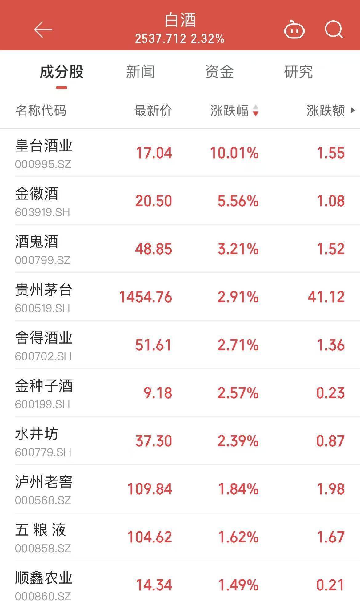 3月16日,A股市场震荡调整之际,白酒板块逆市走出强势行情,成为市场关注焦点。截至10时11分,白酒板块指数涨幅超2%,个股方面,皇台酒业率先涨停;金徽酒、酒鬼酒分别涨5.56%、3.21%;万亿巨头贵州茅台涨超2%,市值重回1.8万亿元以上;舍得酒业、金种子酒等个股也纷纷跟涨。
