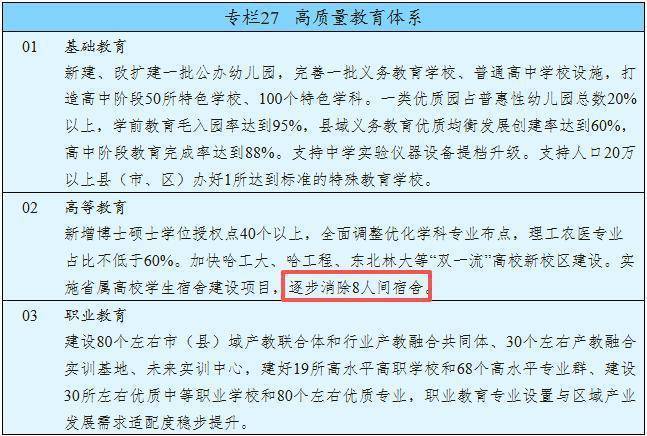 黑龙江省人民政府网站发布《黑龙江省国民经济和社会发展第十五个五年规划纲要》。其中提到,实施省属高校学生宿舍建设项目,逐步消除8人间宿舍。