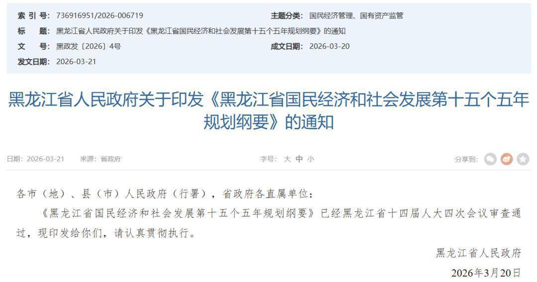 3月21日,黑龙江省人民政府印发《黑龙江省国民经济和社会发展第十五个五年规划纲要》