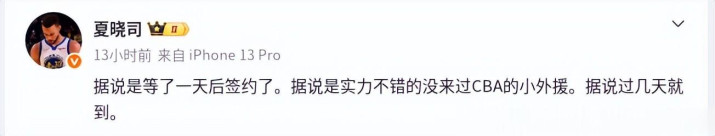 球队“嘴替”夏晓司那边放出风了——新小外援人选基本确定,据说是个“没来过CBA”的生面孔,实力不错,过几天就到。